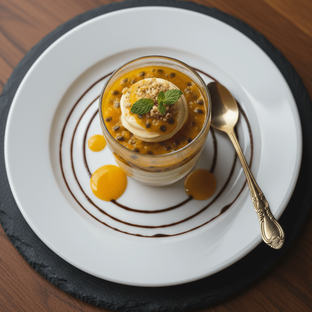 Creamy layered magnolia dessert infused with tangy passion fruit for a tropical twist.Union Layers